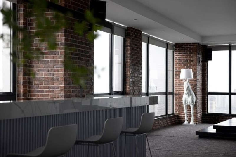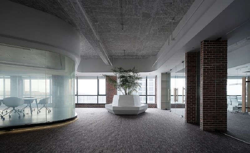 經(jīng)劃分,原本四方的整體空間,大致可歸為公共辦公區(qū)、獨(dú)立辦公室、黨建室、互動(dòng)區(qū)、財(cái)務(wù)室、會(huì)議室、儲(chǔ)藏室、休閑室、檔案室及其他功能區(qū)域。拋去濃烈的墨黑,以灰、白作主色調(diào),既保持了沉穩(wěn)、大氣的理智感,又不使氣氛過(guò)于肅靜。前臺(tái)加入金色提亮,搭配大理石的紋理質(zhì)感,活波間亦不落俗,凈土之上雅致盡顯。在簡(jiǎn)約現(xiàn)代的輕工業(yè)氛圍下,色彩、裝飾往往點(diǎn)到為止。紅磚墻與藤編椅的原生感,質(zhì)樸、不造作,在一片素雅的環(huán)境中,如曇花輕綻,為空間注入悄無(wú)聲息的生命力。