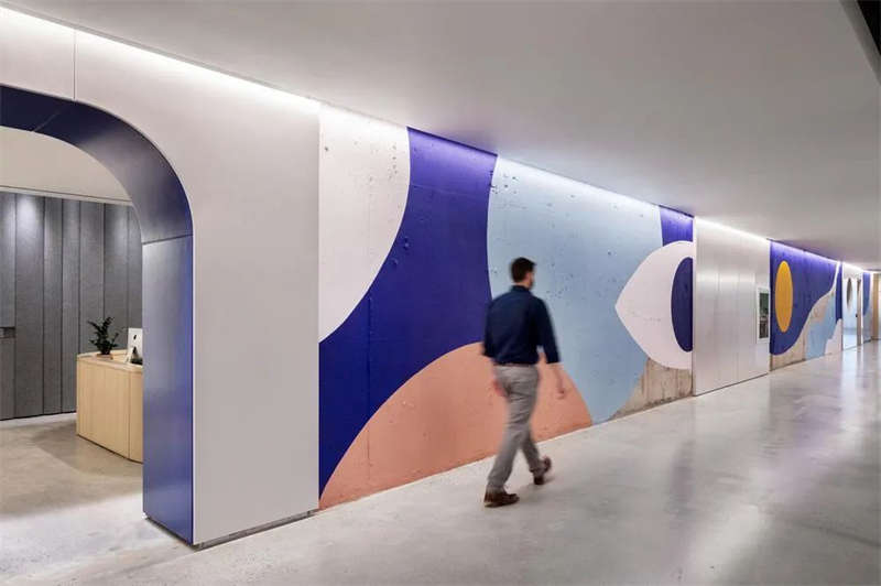 設(shè)計(jì)以部門為單位組建工作“社區(qū)”,并沿著建筑外窗布局。設(shè)計(jì)團(tuán)隊(duì)在方形建筑平面的中央核心區(qū)巧妙規(guī)劃環(huán)境導(dǎo)向設(shè)計(jì):原始的混凝土墻面上繪制的圖形標(biāo)記出東、西方向;而半透明的會(huì)議室所在處則代表了南、北方向。較大的會(huì)議室位于四個(gè)角落布置,以支持就近團(tuán)隊(duì)的便利使用。