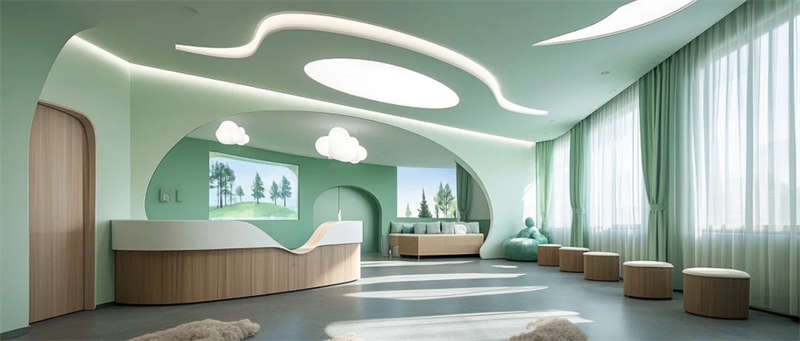 這個(gè)醫(yī)療空間以自然療愈為語言重塑傳統(tǒng)醫(yī)院體驗(yàn)。建筑內(nèi)部流動的淺木與灰綠色系,搭配原生綠植景觀墻,模糊了室內(nèi)外邊界,讓自然光與綠意成為治愈媒介。門診走廊的弧形墻面消解機(jī)構(gòu)冰冷感,兒童診區(qū)的森林投影與云朵軟包,用敘事化設(shè)計(jì)緩解診療焦慮。