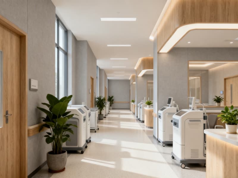 設(shè)計(jì)中融入自然元素與人文關(guān)懷,通過大面積采光引入自然光線,搭配隨處可見的綠植景觀,緩解醫(yī)療環(huán)境帶來的緊張感。家具與設(shè)施均采用圓潤的造型與舒適的材質(zhì),避免尖銳棱角,同時(shí)注重防滑、無障礙等細(xì)節(jié)設(shè)計(jì),適配休養(yǎng)人群的使用需求。