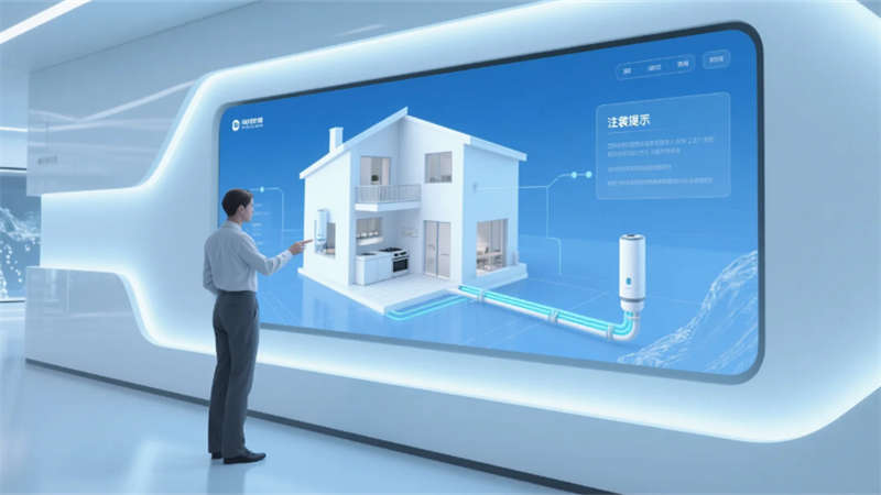 展廳以環(huán)形動(dòng)線串聯(lián)六大核心模塊:入口10米寬LED水幕墻動(dòng)態(tài)演繹凈水原理;中央懸浮式產(chǎn)品矩陣展臺(tái),通過(guò)全息投影拆解RO膜過(guò)濾技術(shù);實(shí)景化場(chǎng)景區(qū)1:1復(fù)刻家庭廚房、商務(wù)辦公樓及工業(yè)廠房,搭配交互式水質(zhì)監(jiān)測(cè)實(shí)驗(yàn)臺(tái);獨(dú)創(chuàng)的“虛擬管家”AR系統(tǒng),可生成個(gè)性化凈水方案并投射至合肥典型戶型模型??臻g頂部采用參數(shù)化設(shè)計(jì)的波浪形燈網(wǎng),象征長(zhǎng)江與淮河水系交匯,地面嵌入城市節(jié)水?dāng)?shù)據(jù)可視化地磚,凸顯本土環(huán)保責(zé)任感。